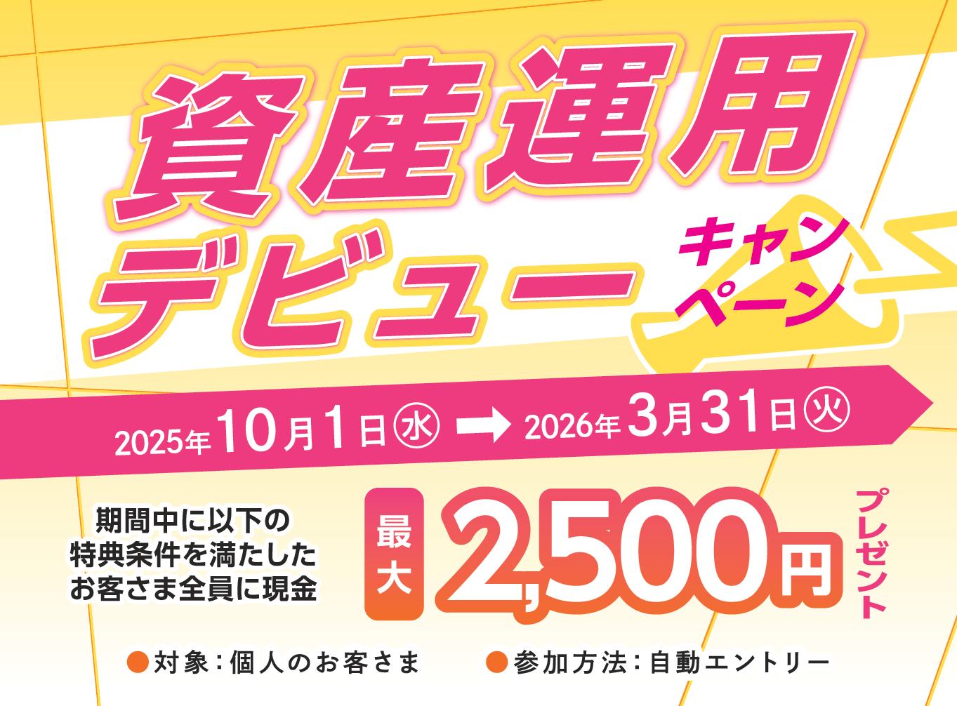 - 投信積立については2026年4月30日時点で2025年9月30日時点と比較して1万円以上増額(複数銘柄可、合算可)されている方が対象となります。