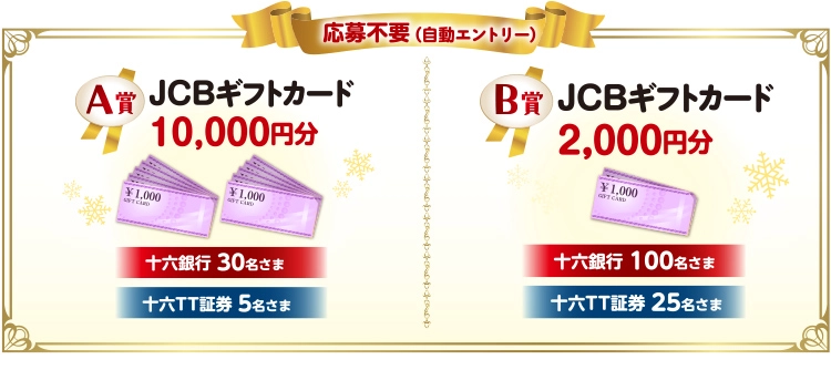 - 賞品は、特賞については2026年2月中旬頃、A賞・B賞については3月上旬頃に十六銀行および十六TT証券にお届けのご住所あてにお送りいたします。