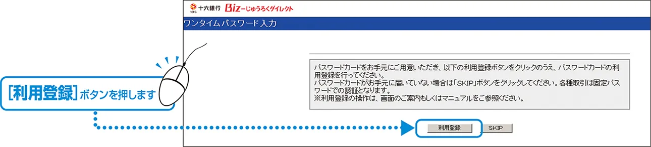 取引時に音声付きワンタイムパスワードカードを利⽤するためには、下記のとおり、Biz-じゅうろくダイレクト上でパスワードカードの利用登録を行ってください。