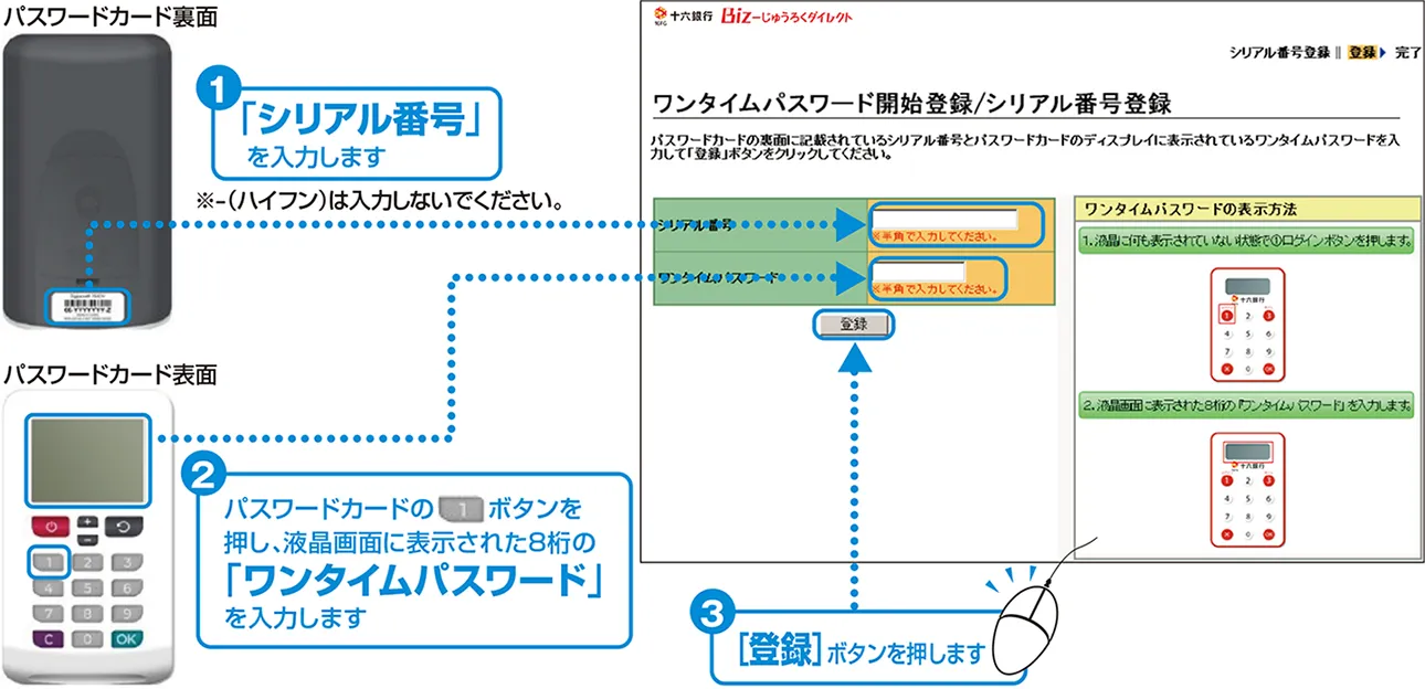 以下記載の「シリアルナンバーの確認」と「ワンタイムパスワード発行操作」は、後述「Biz-じゅうろくダイレクトでの利用登録について」でも利用します。