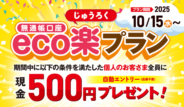 ・既にお持ちの普通預金口座を無通帳口座「eco楽」に切替えいただき、お切替えいただいた月末時点で預金残高5,000円以上